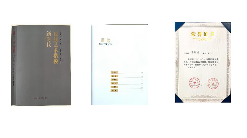 为迎接党的二十大胜利召开,扎实推进“奋进新征程·建功新时代”重大主题宣传,大力营造崇德向善、见贤思齐、德行天下的浓厚氛围,文化部文化艺术人才中心、中国文学艺术界联合会隆重推出大型艺术宣传特辑《新时代民族艺术楷模》,并在中国图书出版社出版。我校艺术与设计学院教师李哲虎创作的《方寸乾坤》、《苍生》、《共奏》等多幅作品入选。