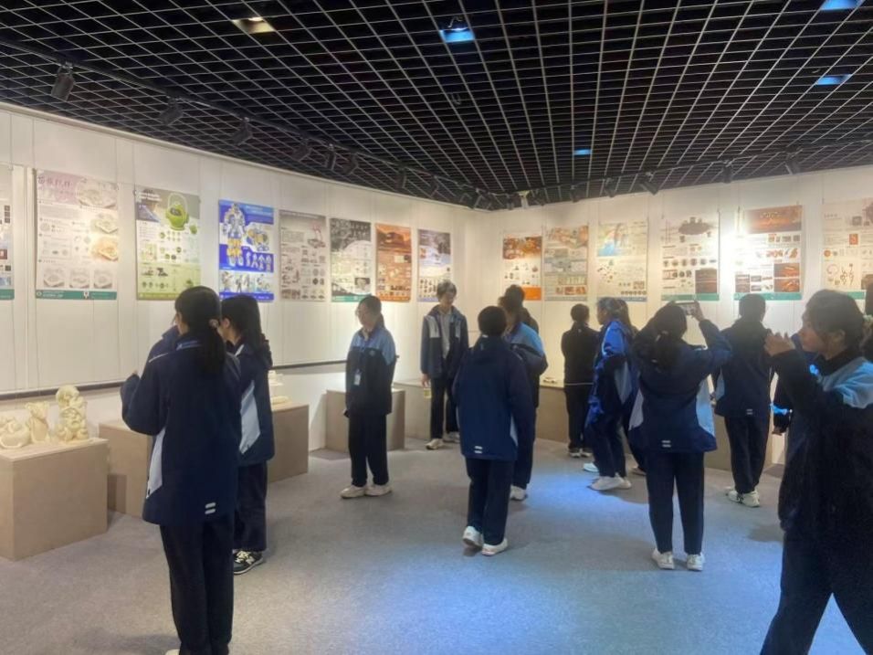 接着,大家移步艺术学院展厅,观摩在校大学生的优秀作品,并走进课堂,现场感受2025级中本贯通大一学生的实践教学环节。产品专业教师解芳老师与材料工程学校的两位老师就大一新生的学习情况进行了交流探讨。