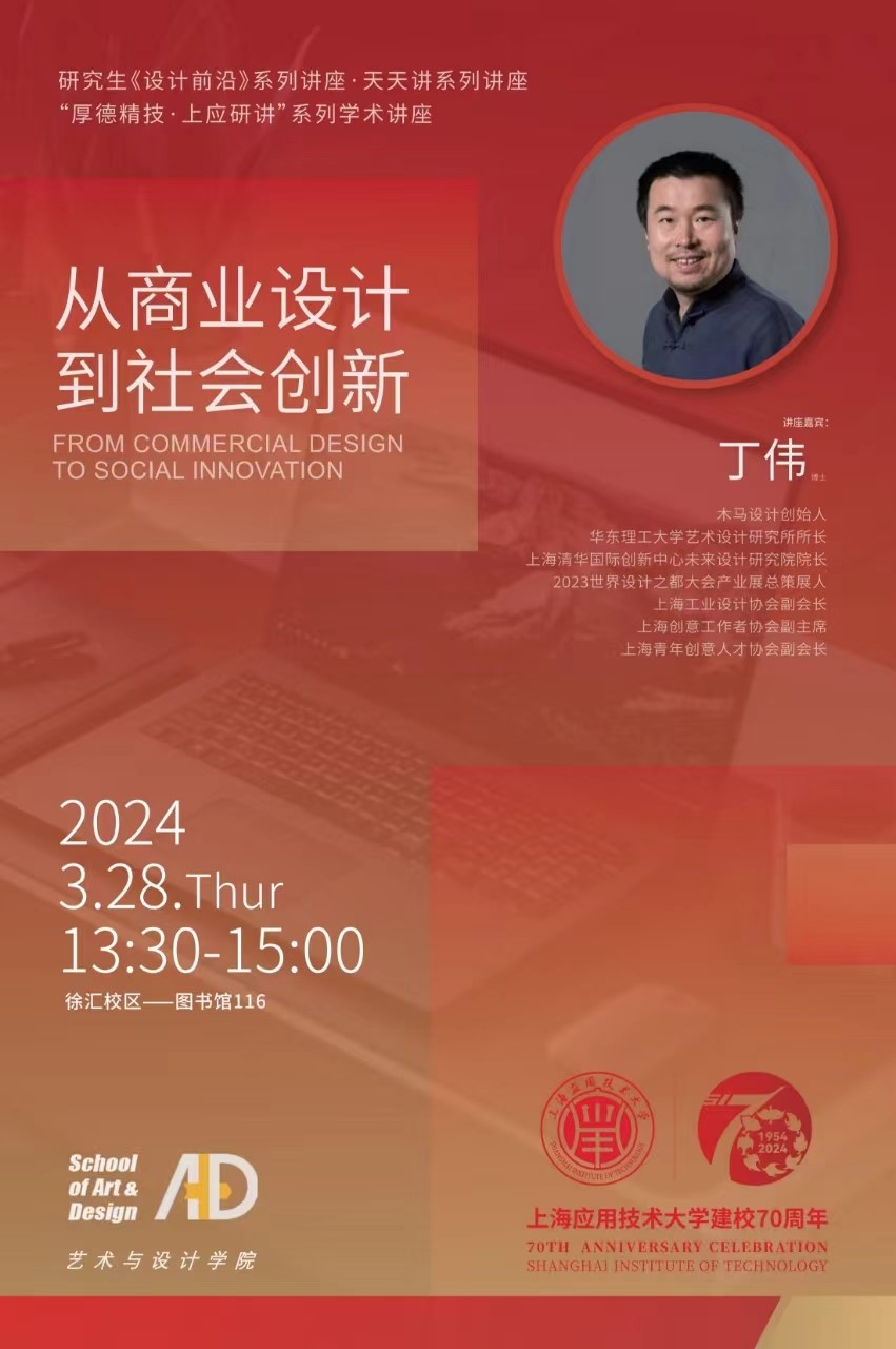 2024年3月28日13:30,我院有幸邀请到了木马设计创始人丁伟老师在徐汇校区图书馆116开展了《从商业设计到社会创新》主题讲座,带领同学们一起探索设计的价值。本次讲座由艺术与设计学院侯敏枫教授主持。