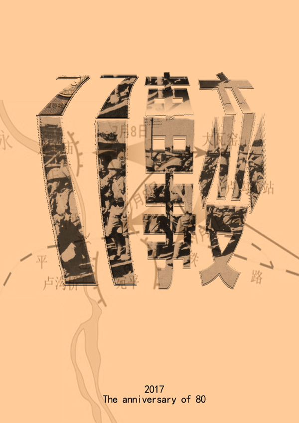 曾玮琪同学的的海报以著名的“七七事变”为主题将其设计成一个转折的形象,给人一种两边延伸的错觉感,并在版面中嵌入代表性的历史照片。海报独具匠心地以当时战略路线图作为底色,暗橙色调,极富历史气息。