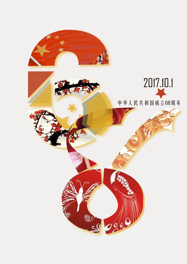 谈心怡同学的海报以祖国生68周年为主线,画面以68两个数字为主体,将有中国特色的人事物拼凑成68,又将6与8两个数字的一部分相互穿插,表现中国人民共和国人民是相互联系,密不可分。整张色调以红、黄两色为主色,更是中国特色的象征。