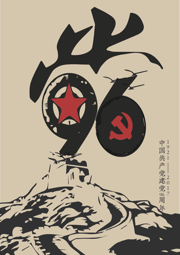石韵同学的海报也独具一格,十分引人注目。海报整体以素洁的米色奠定整体的色调,中心的文字图案则巧妙地将“党”字进行变形,删减了部分笔画并独具匠心地把建党“96”周年纪念的元素嵌入其中,寓意党对我们如今幸福生活的重要性和繁荣的生命力。画面远处绵延不绝的长城剪影则暗示着党一路走来开天辟地的壮举如同长城一般是人民智慧和血汗的结晶,令人敬畏。
