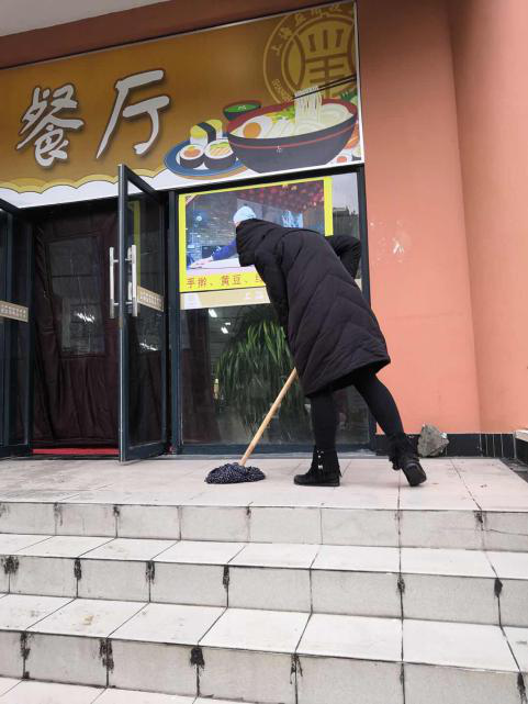 在食堂门口:正值雨季,为了防止进进出出的师生滑倒,我们的成员正在清理湿滑的地面。用自己的实际行动诠释着永恒的雷锋精神。