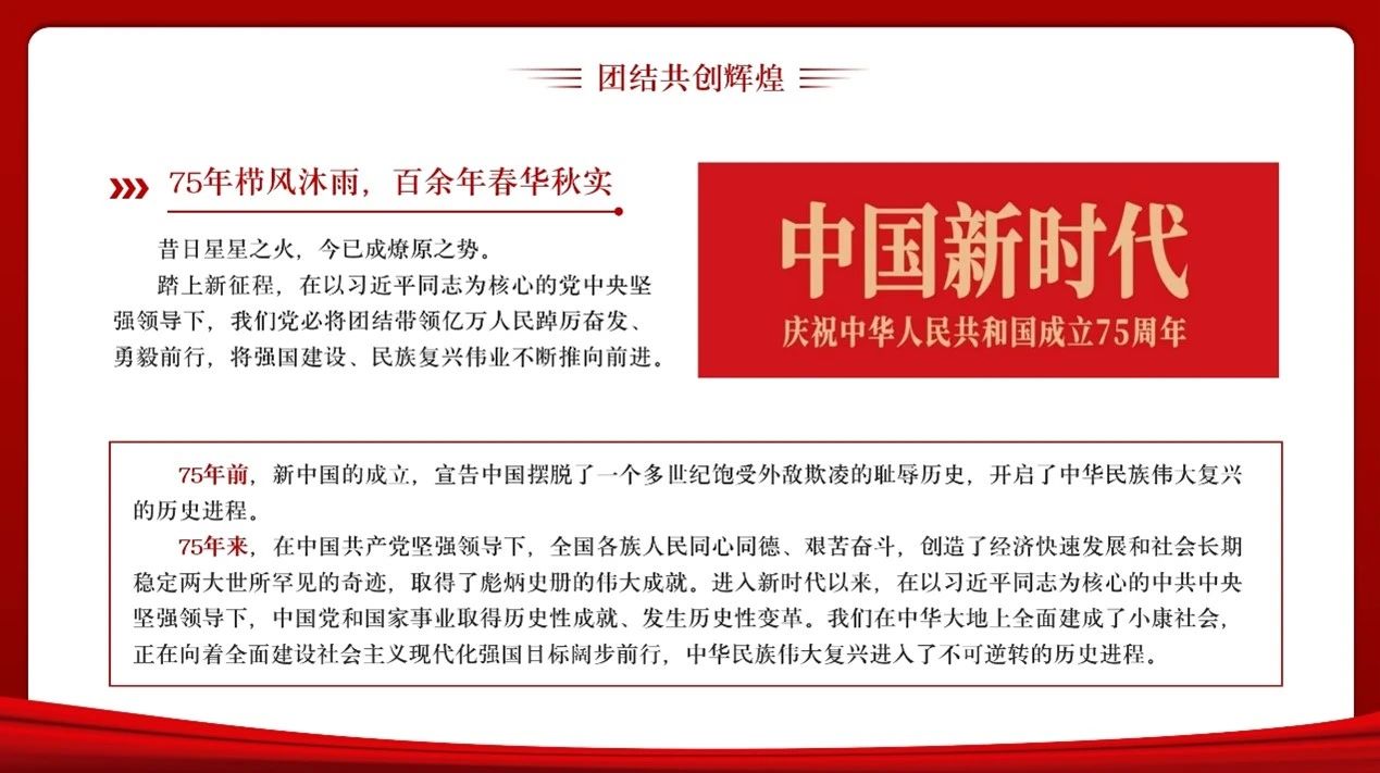 第二部分大家共同回首了往昔成就,过去75年里不断推进党的建设,教育事业、文化、经济社会与工业的全方面发展使中国巍然屹立在世界东方。75年来,我们党团结带领全国各族人民历经风雨洗礼、走过峥嵘岁月,实现了经济快速发展和社会长期稳定,绘就了波澜壮阔的历史画卷,实现中华民族伟大复兴进入不可逆转的历史进程。