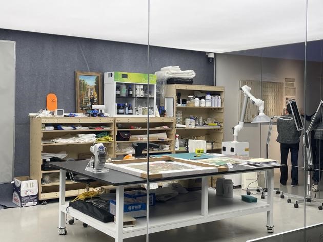 除了展示油画原作外,展览还设置了一个独特的玻璃修复间。这个修复间装满了各种刷子工具和化学试剂,修复师们穿着白大褂,使用紫外线和正常光源对油画进行细致检测和修复。策展人黄诗云表示:“我们希望将展厅打造成一个公共教育课堂,让观众们能够与油画修复师进行互动,亲眼见证油画的变化。”