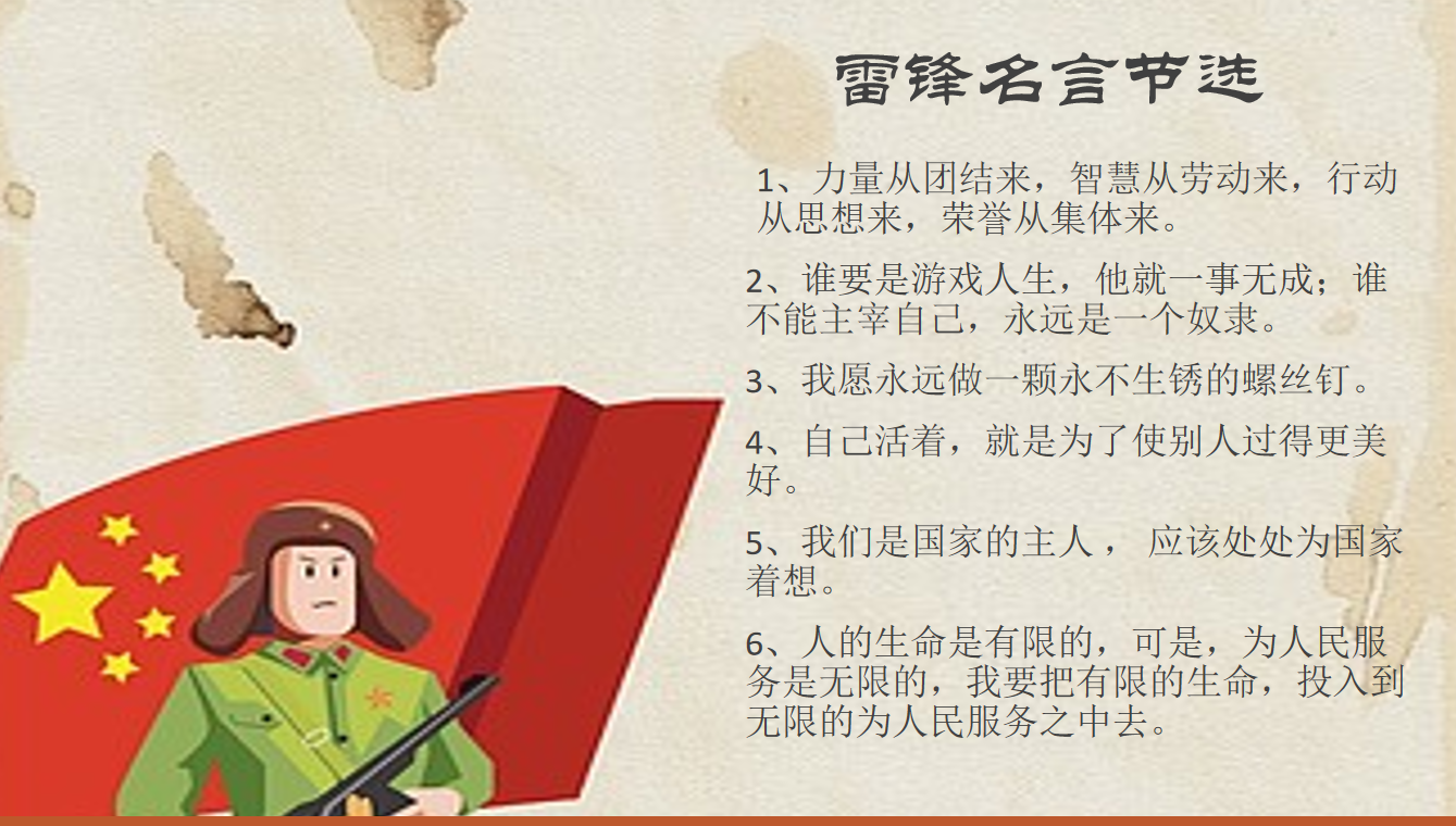 第五部分,雷锋名言节选。雷锋的名言,深深感染和鼓舞着每一位个体不断进取,也能帮助我们正确认识人生的价值和意义,更好地提升思想道德素质,培养顽强毅力,塑造高尚人格。