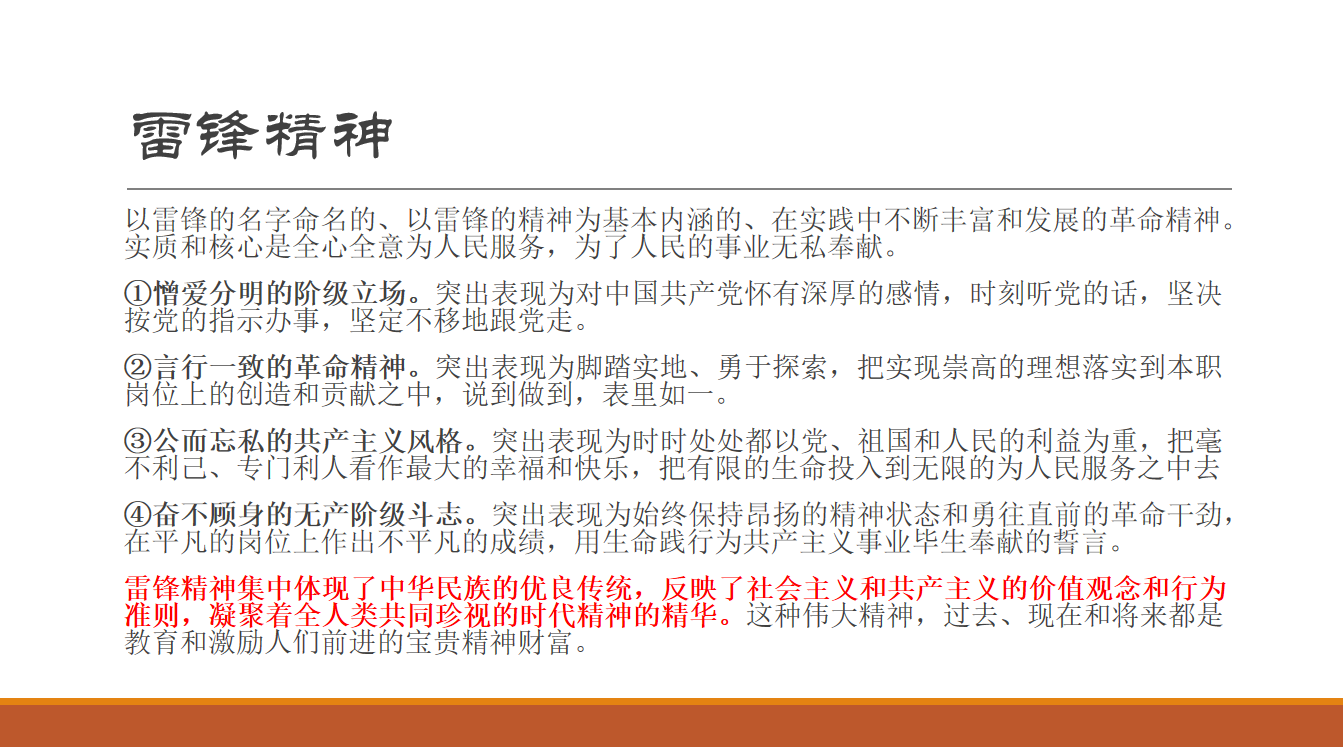 第二部分则是向大家介绍了雷锋精神及其内涵——憎爱分明的阶级立场,言行一致的革命精神,公而忘私的共产主义风格以及奋不顾身的无产阶级斗志”。