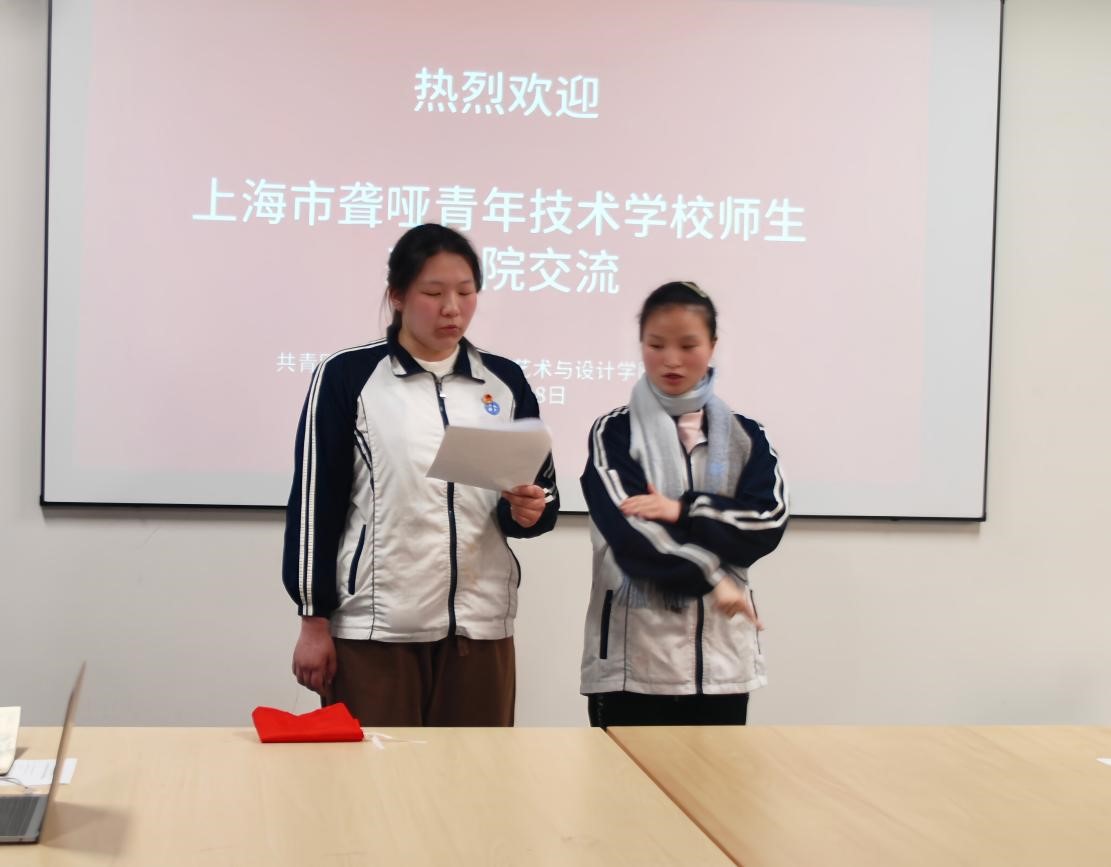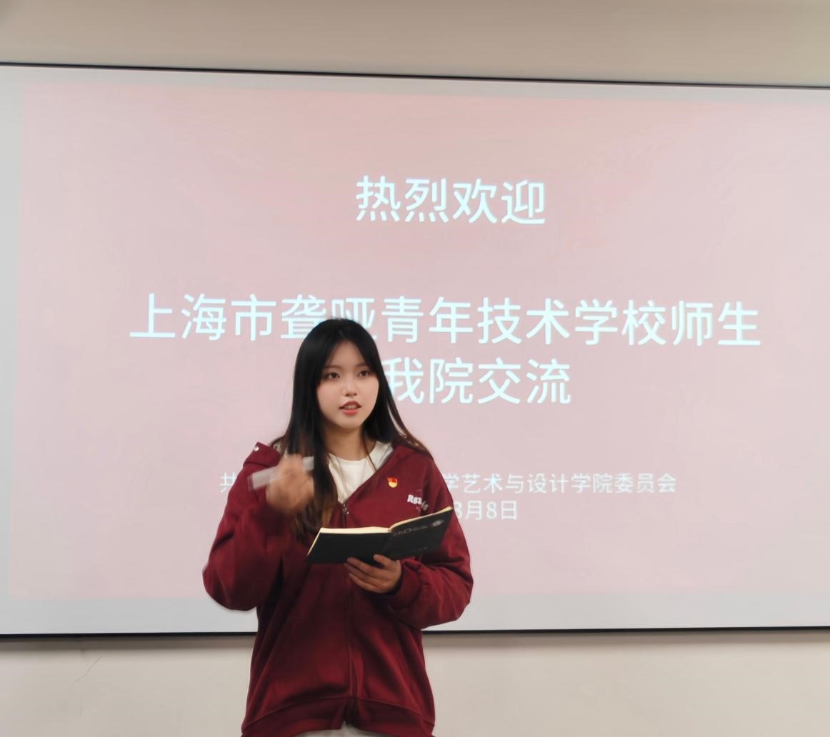2024年3月8日15:00在艺术楼101室召开了上海应用技术大学艺术与设计学院与上海市聋哑青年技术学校的交流会。本次会议邀请到上海市聋哑青年技术学校团委书记郁丽倩老师、艺术与设计学院特教党支部书记吴斐老师、艺术与设计学院团委书记江旺兴老师及学生代表进行交流学习。