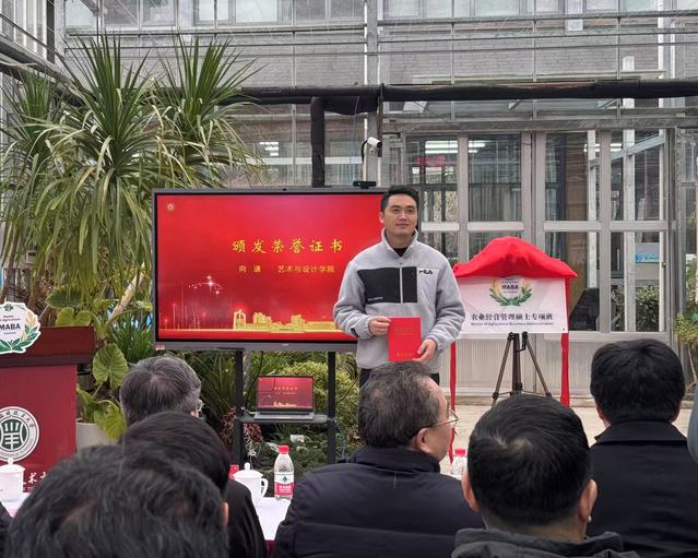 2025年2月25日,上海应用技术大学农业经营管理硕士专项班开班仪式在奉贤校区生态植物园隆重举行。上海应用技术大学党委书记郭庆松、上海市教育委员会副主任刘力、上海市教育委员会高教处处长杨颉、上海市农业农村委员会副主任夏明林、上海市农业农村委员会干部人事处处长杜小强等嘉宾出席。仪式由上海应用技术大学副校长毛祥东主持。艺术学院教师向谦设计的LOGO被正式采纳为专项班的专属标识,并颁发了荣誉证书。
