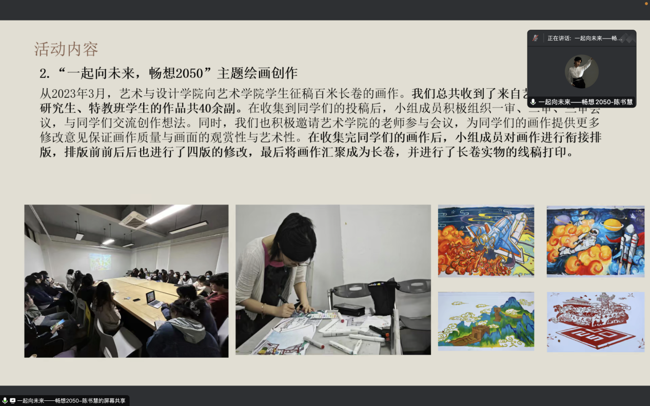 首先进行答辩的是“一起向未来——畅想2050”团队,该团队基于对“党的二十大精神”学习与上应青年对于未来的美好憧憬展开。遵循“结合专业学习、深化教师指导、立足服务社会、促进成长成才”的理念,学习二十大相关精神,将围绕二十大精神、百年党史和百年团史,国家“十四五”规划等以及上应青年对于美好生活的畅想,结合自己的专业特色,将思想政治教育与美育相融合,以绘画的形式表达心中对党和国家的热爱以及对于中国美好未来的期盼。