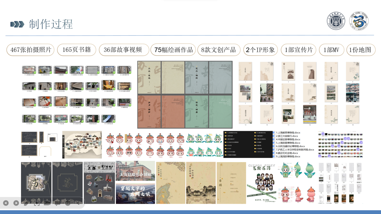 紧接着“文质并存,今史相继 ——艺汇苏州河畔文化魅力”团队,实地探访苏州河沿岸40余个地点,并对周边居民和游客进行采访,收集相关资料并拍摄项目宣传片和宣传视频,制作苏州河历史文脉游览电子地图,设计吉祥物IP形象、文创产品,撰写有关苏州河历史风貌和民生故事的文稿,制作微视频以及原创歌曲MV《江河同行》介绍沿岸特色建筑、人文等。通过书籍、网络媒体、与社区街道合作等多种方式同步宣传。本项目旨在用艺术的方式讲述“水岸故事”,诠释艺术与建筑的奇妙融合,引导当代青年在苏州河畔共赴一场青春之约,在艺术中寻历史足迹,观城市新貌,品苏河魅力,感受一座城市的温度。