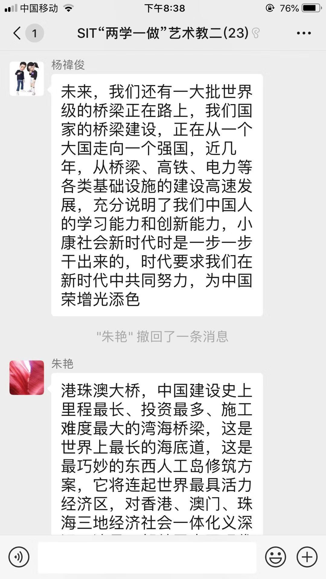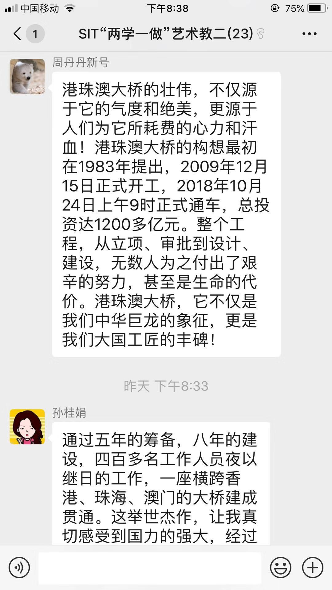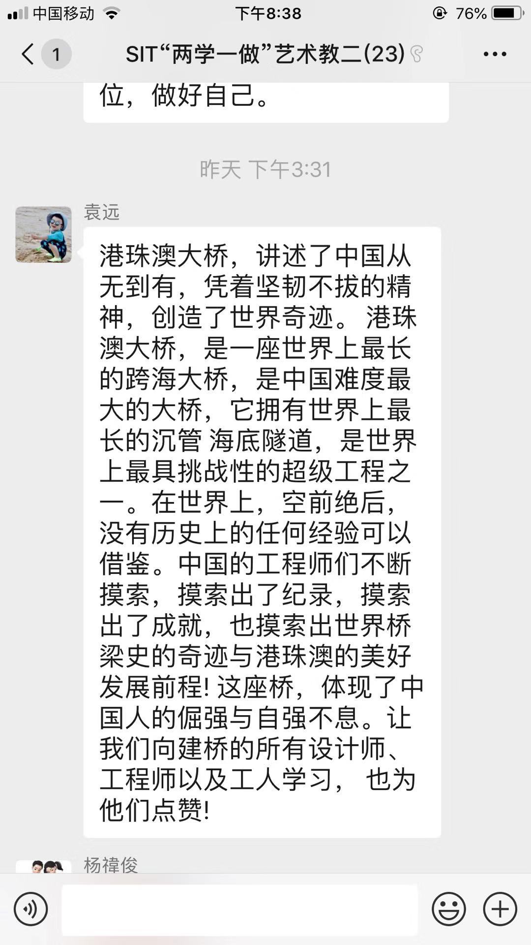 观影结束后,支部党员们马上在微信群中分享了观后感,纷纷表示自己被大桥建设者艰苦奋斗的工作精神和敢为人先的创新精神深深感动,为中国改革开放和现代化建设成就而深感自豪。
