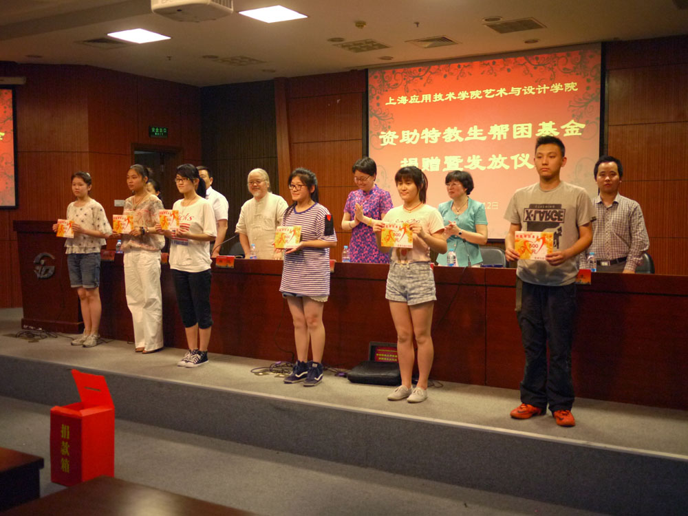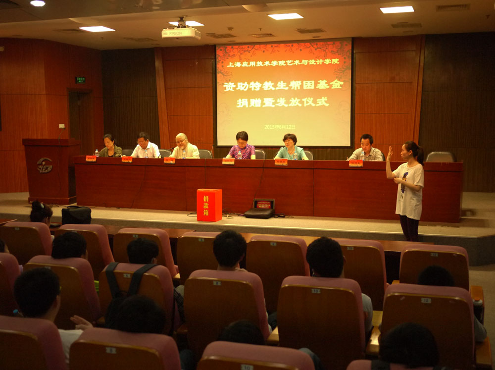 艺术与设计学院特教帮困基金捐赠暨发放仪式于2015年6月12日下午1:00,在徐汇校区图文信息楼116室举行。校党委副书记、副校长张艳萍,学工部副部长、学生处副处长翁德明、组织部专职组织员侯建生、艺术与设计学院领导班子成员及全体党员师生共200余人参加了此次发放仪式。会议由艺术与设计学院院长林迅主持。