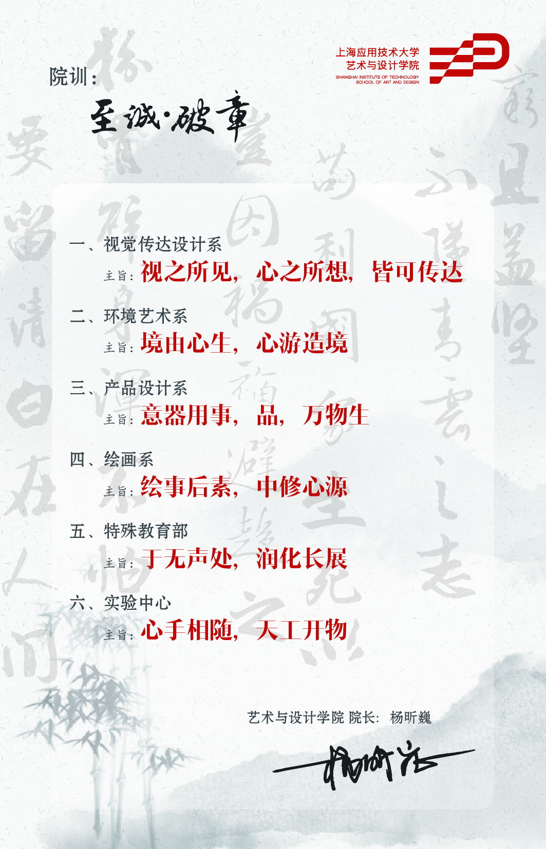 学院各系均有明确主旨,彰显专业特色与育人初心:视觉传达设计系主旨“视之所及,心之所想,皆可传达”;环境艺术系主旨“境由心生、心游造境”;产品设计系主旨“意器用事,品,万物生”;绘画系主旨“绘事后素、中修心源”;特殊教育部主旨“于无声处、润化长展”;实验中心主旨“心手相随,天工开物”。这些主旨与院训相辅相成,共同构成学院思想文化建设的核心内涵,为人才培养指明方向。